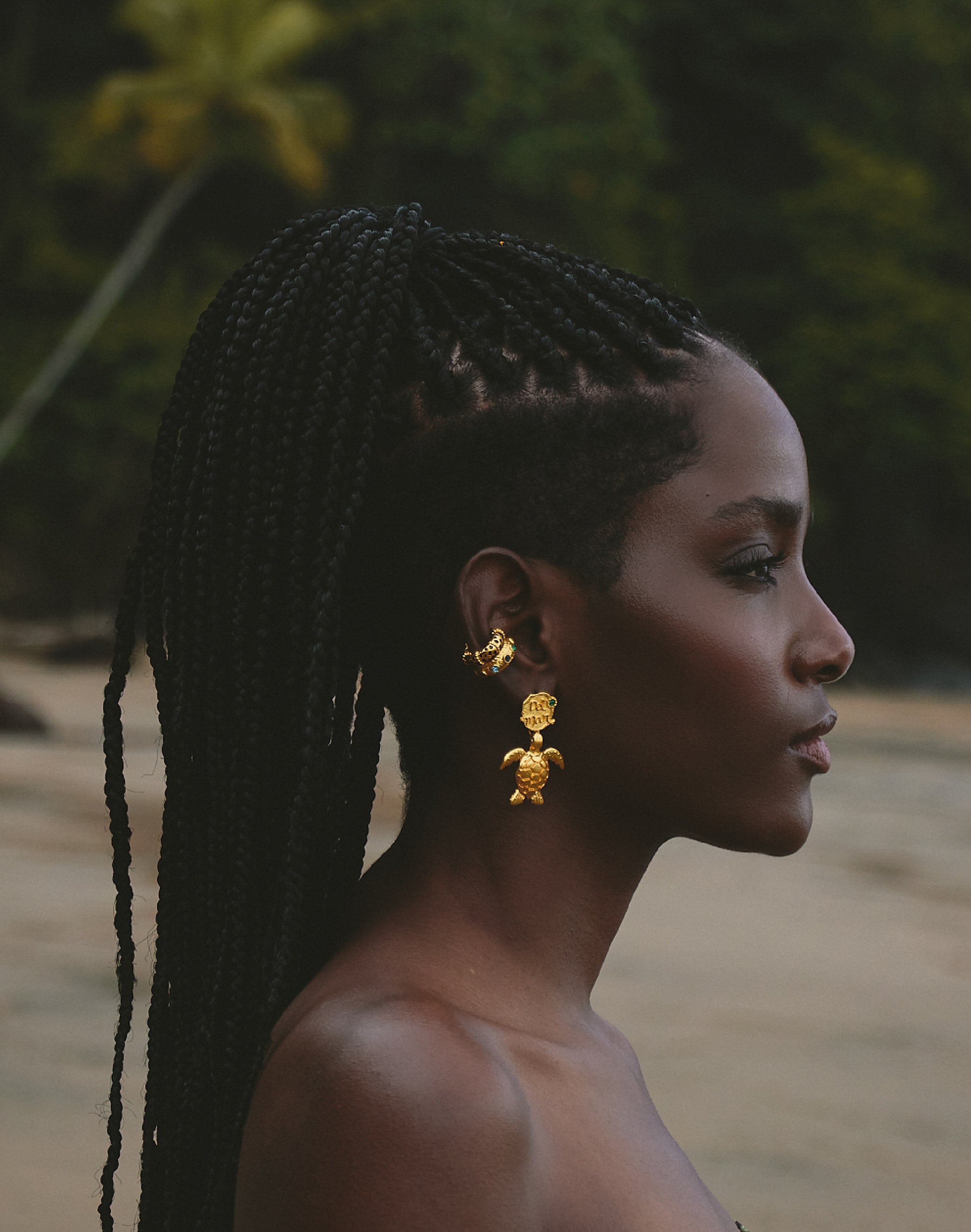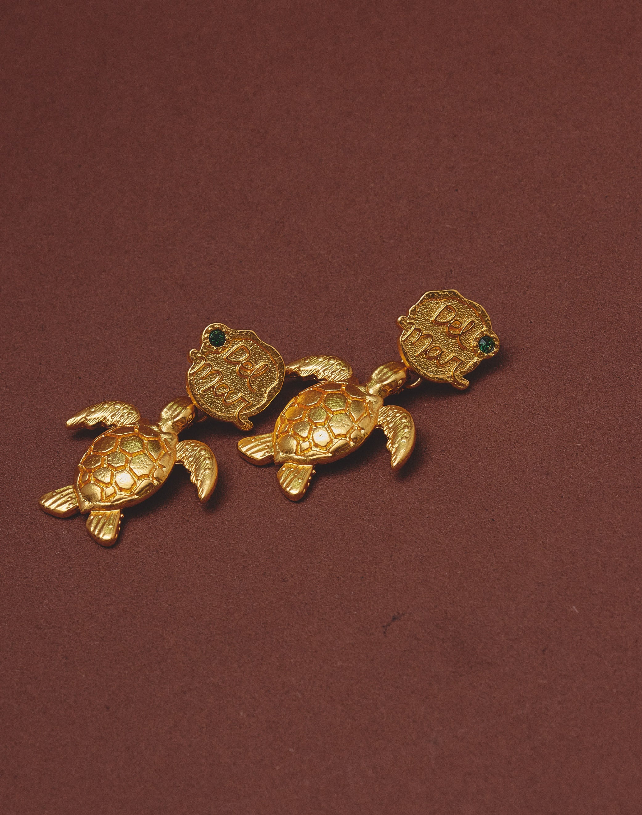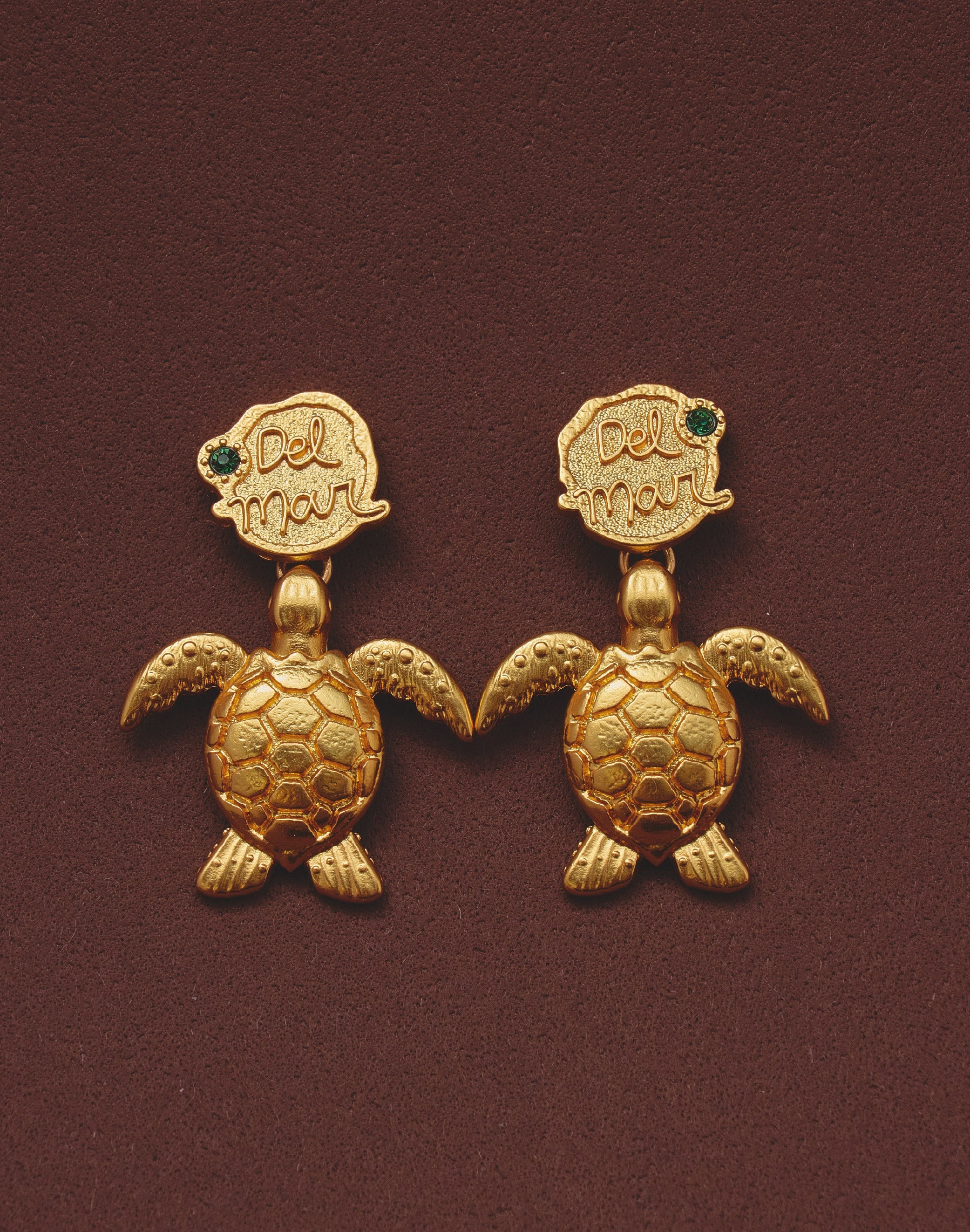 Una pieza que celebra el recorrido entre el mar y la tierra. Estos pendientes combinan una medalla con el texto “del mar”, una piedra cónica en tono verde esmeralda y una tortuga carey colgante, creando una composición rica en significado y detalle.