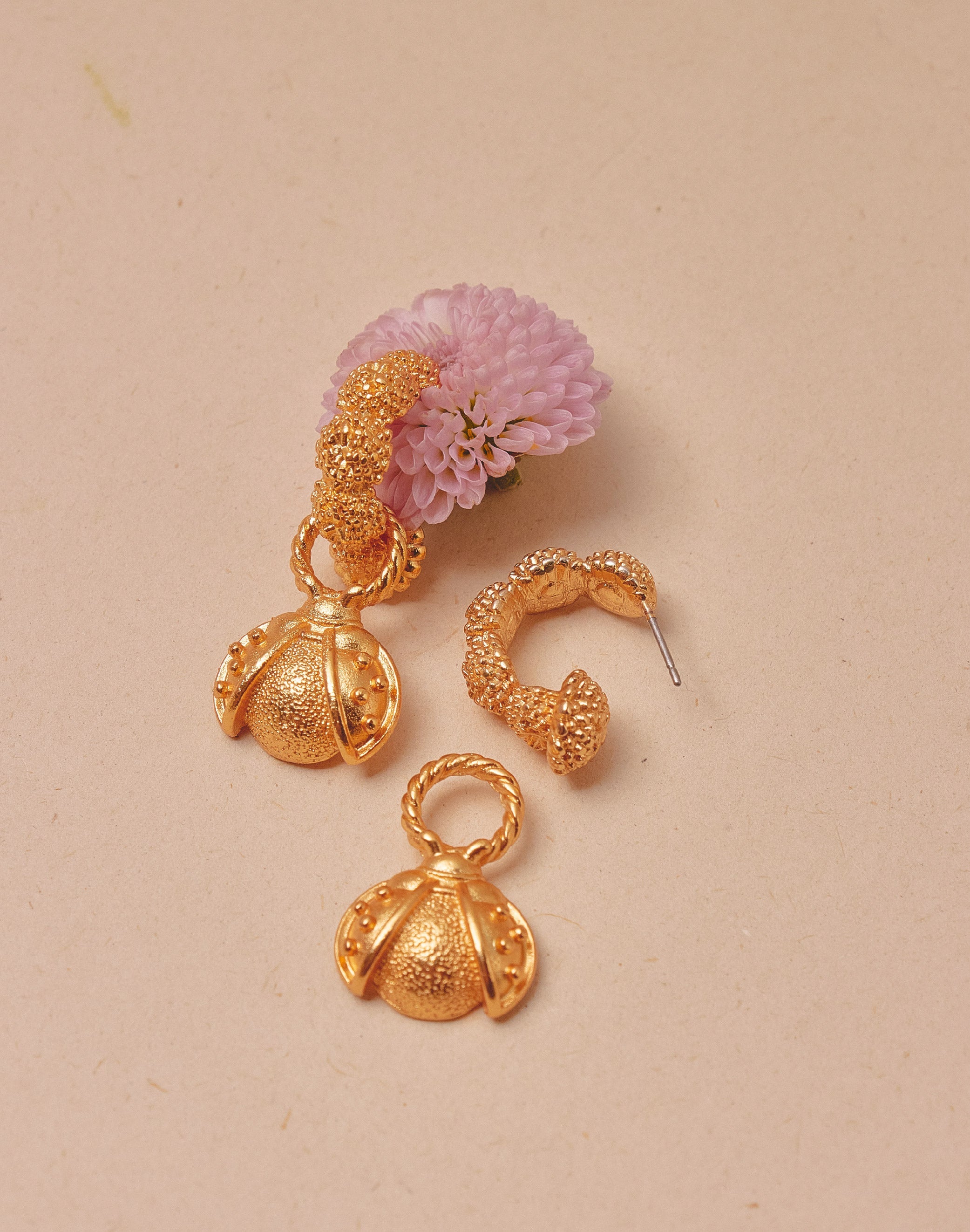 - Candonga crisantemo con dije mariquita: 18 mm alto × 18 mm ancho