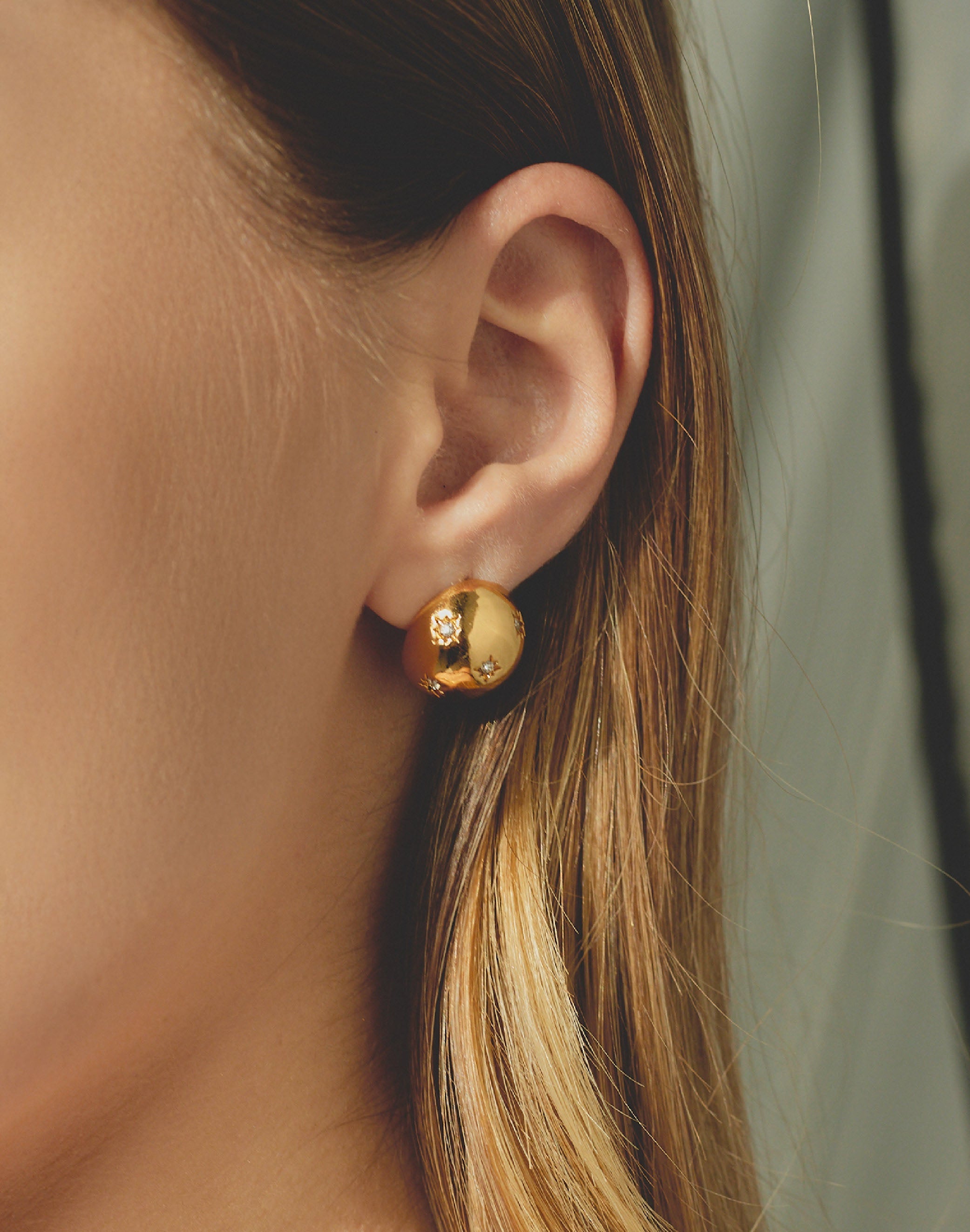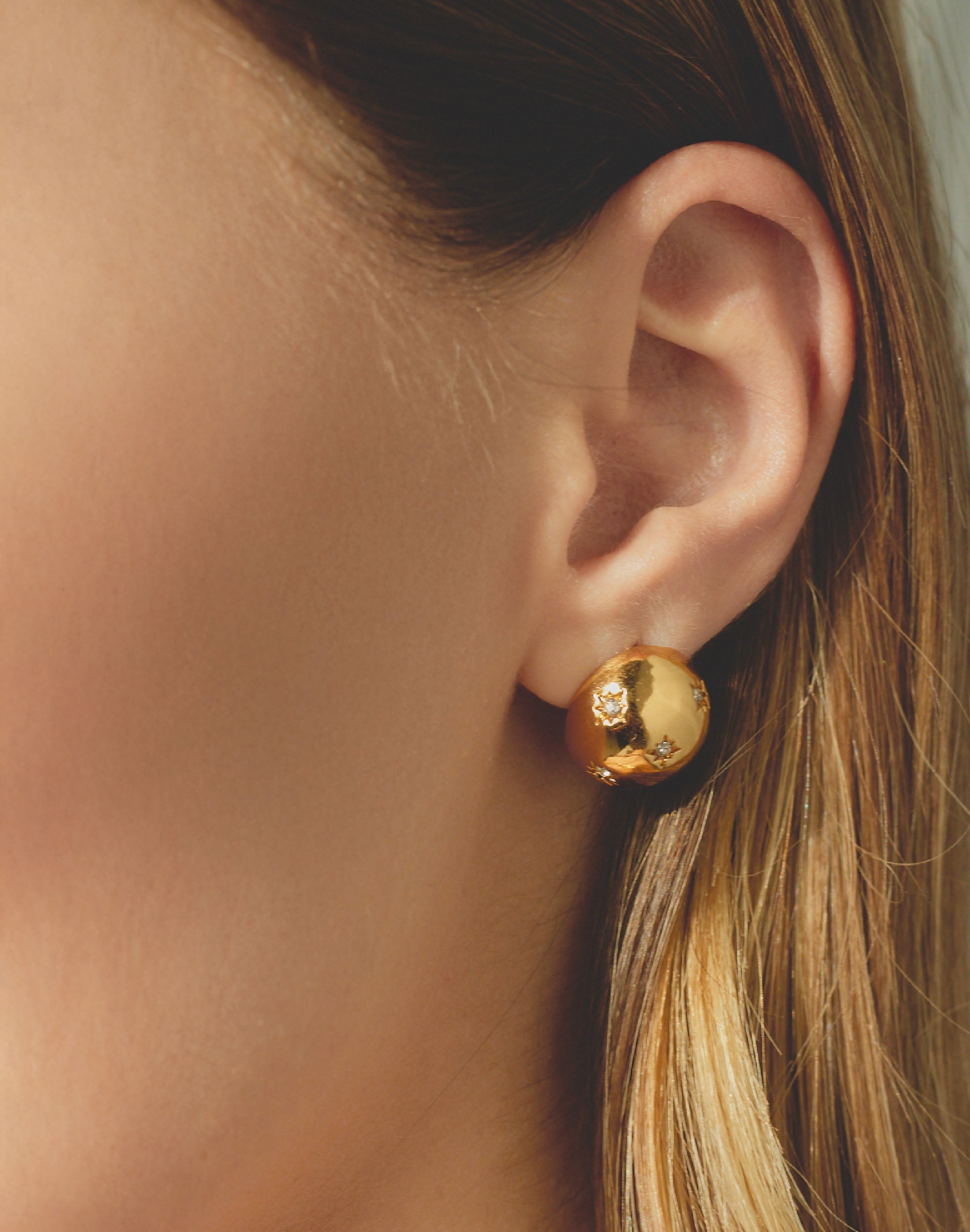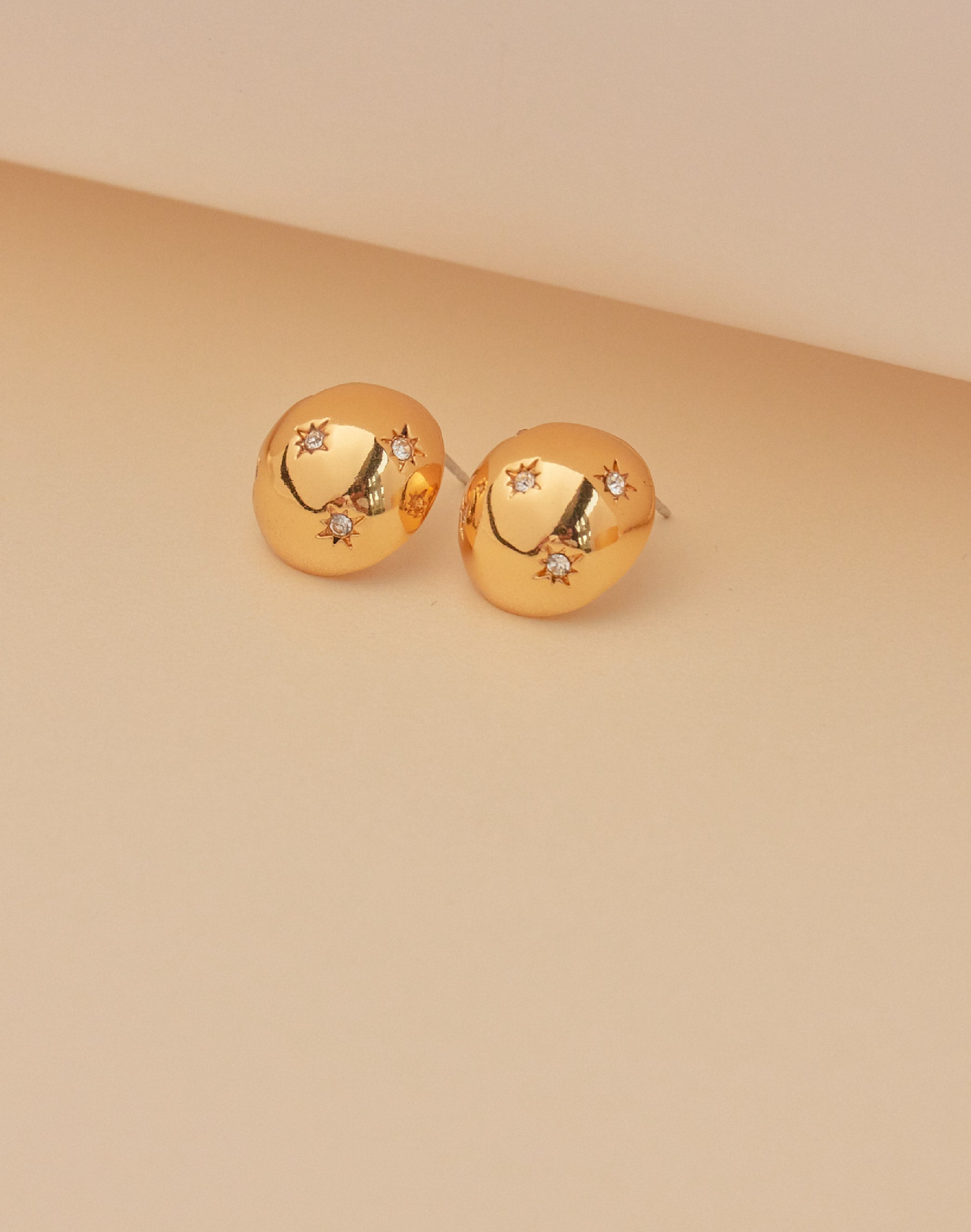 Dale un toque brillante a tu look con estos aretes en forma de media esfera. Sus cristales clear incrustados capturan la luz para que deslices destellos cada vez que muevas...