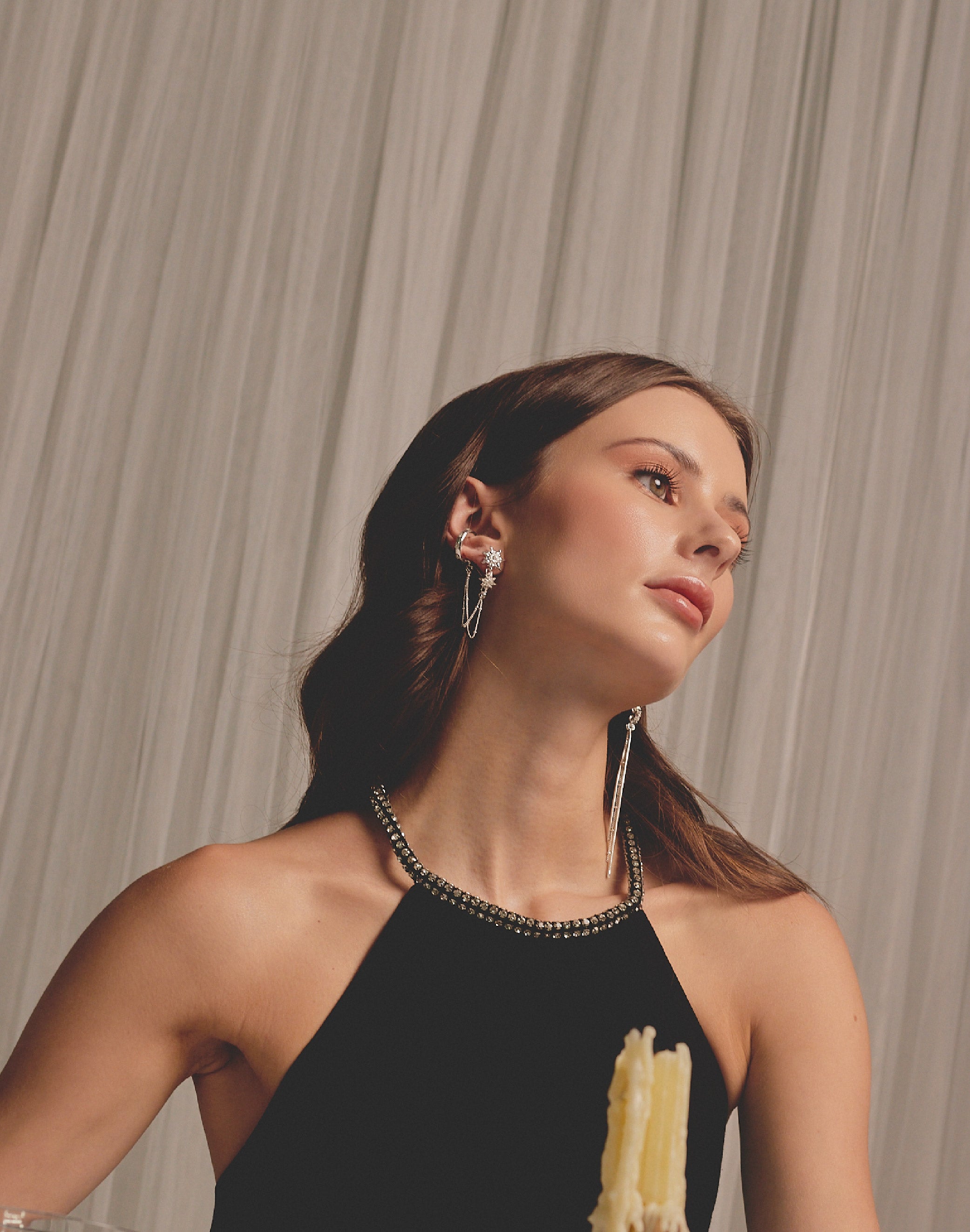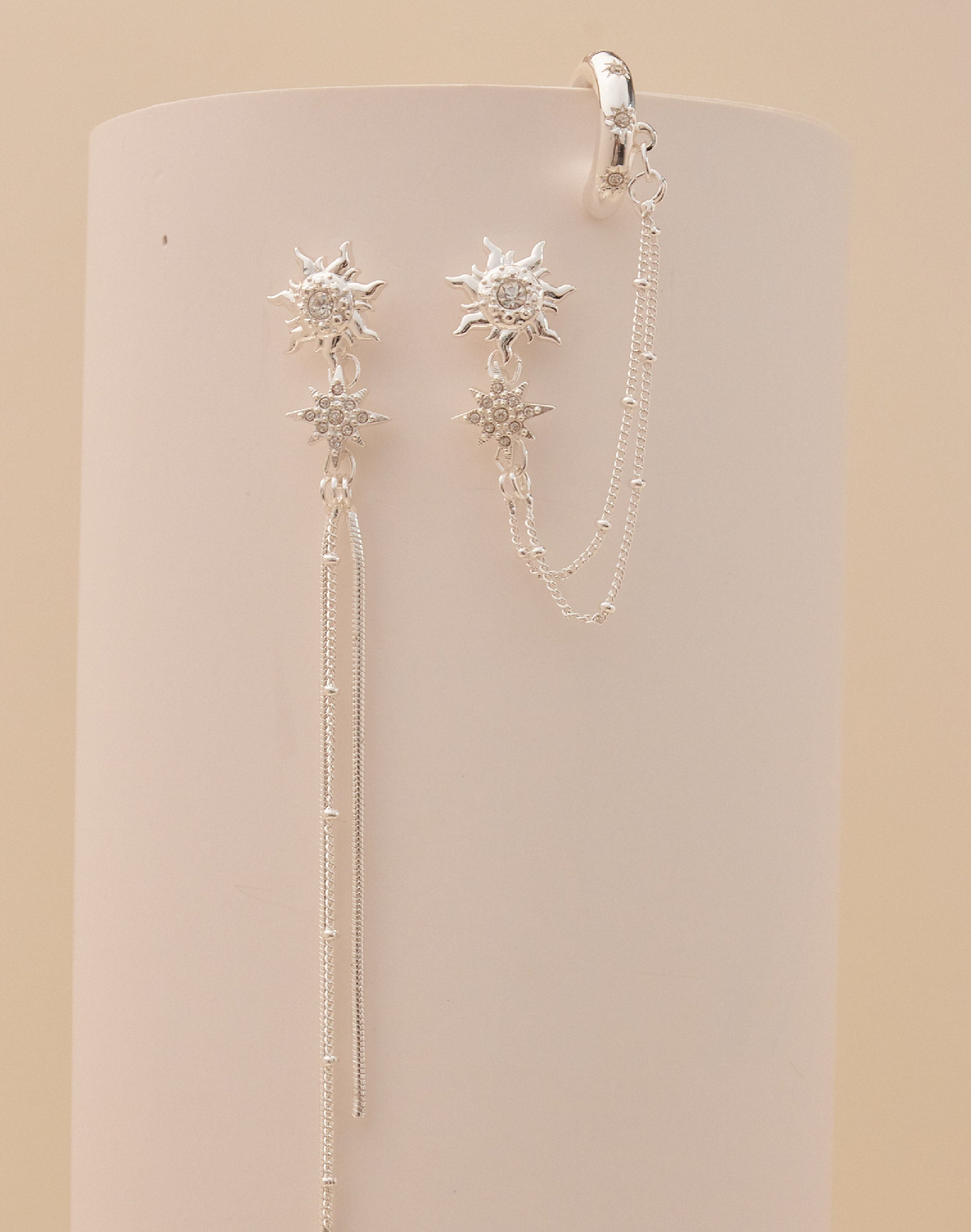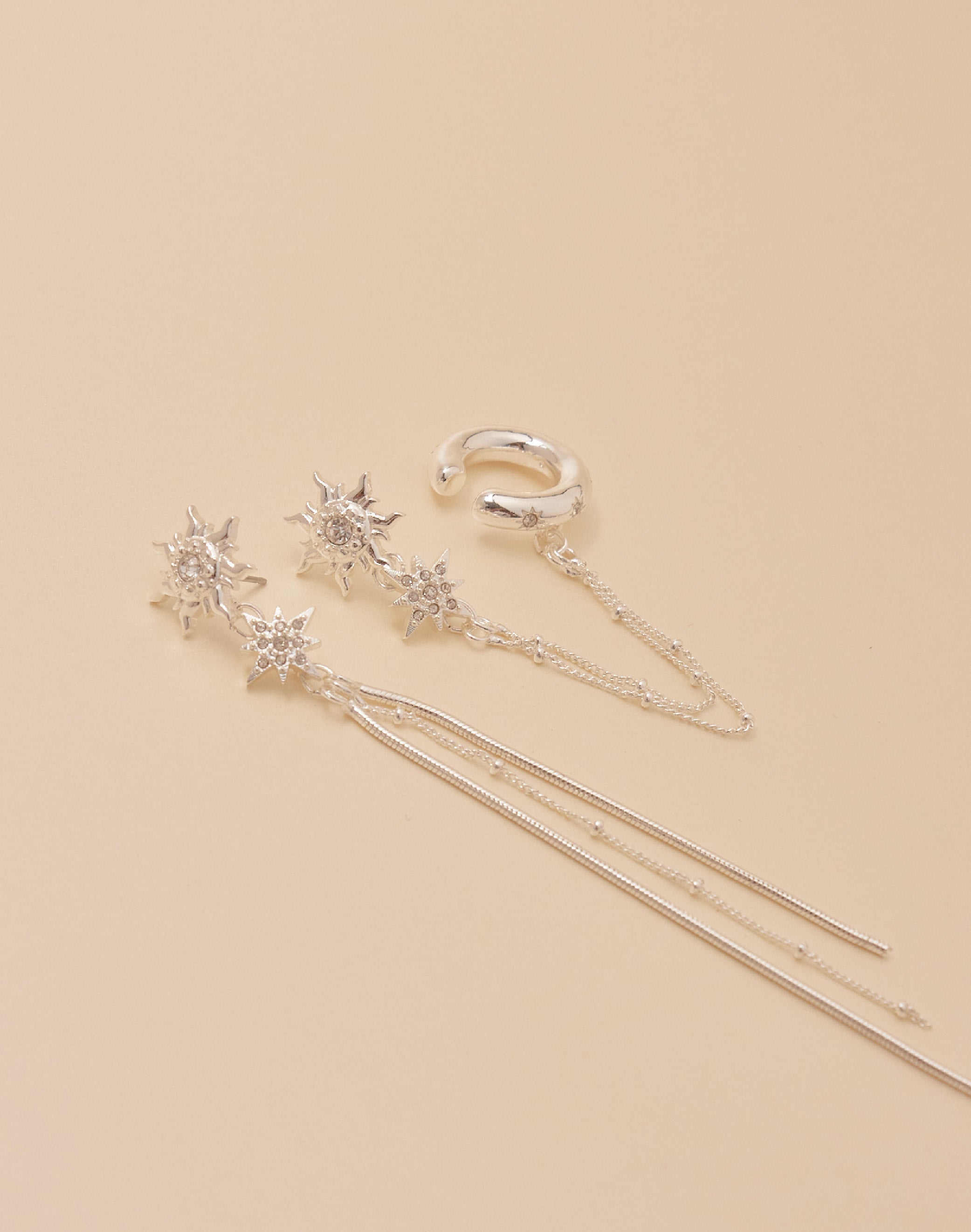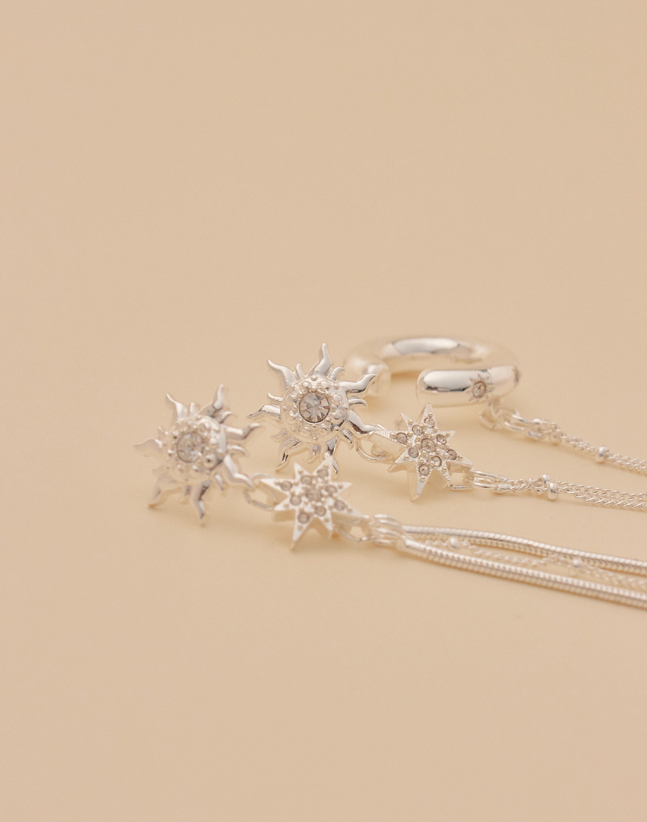 Descubre los Aretes Sunlight, un par asimétrico que ilumina tu look con detalle y originalidad. Una pieza combina un earcuff unido a una delicada cadena, mientras que la otra deja...