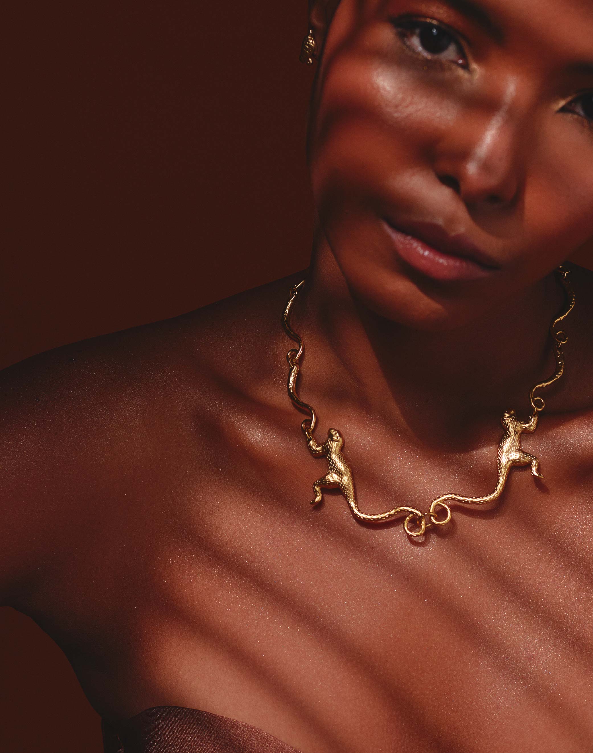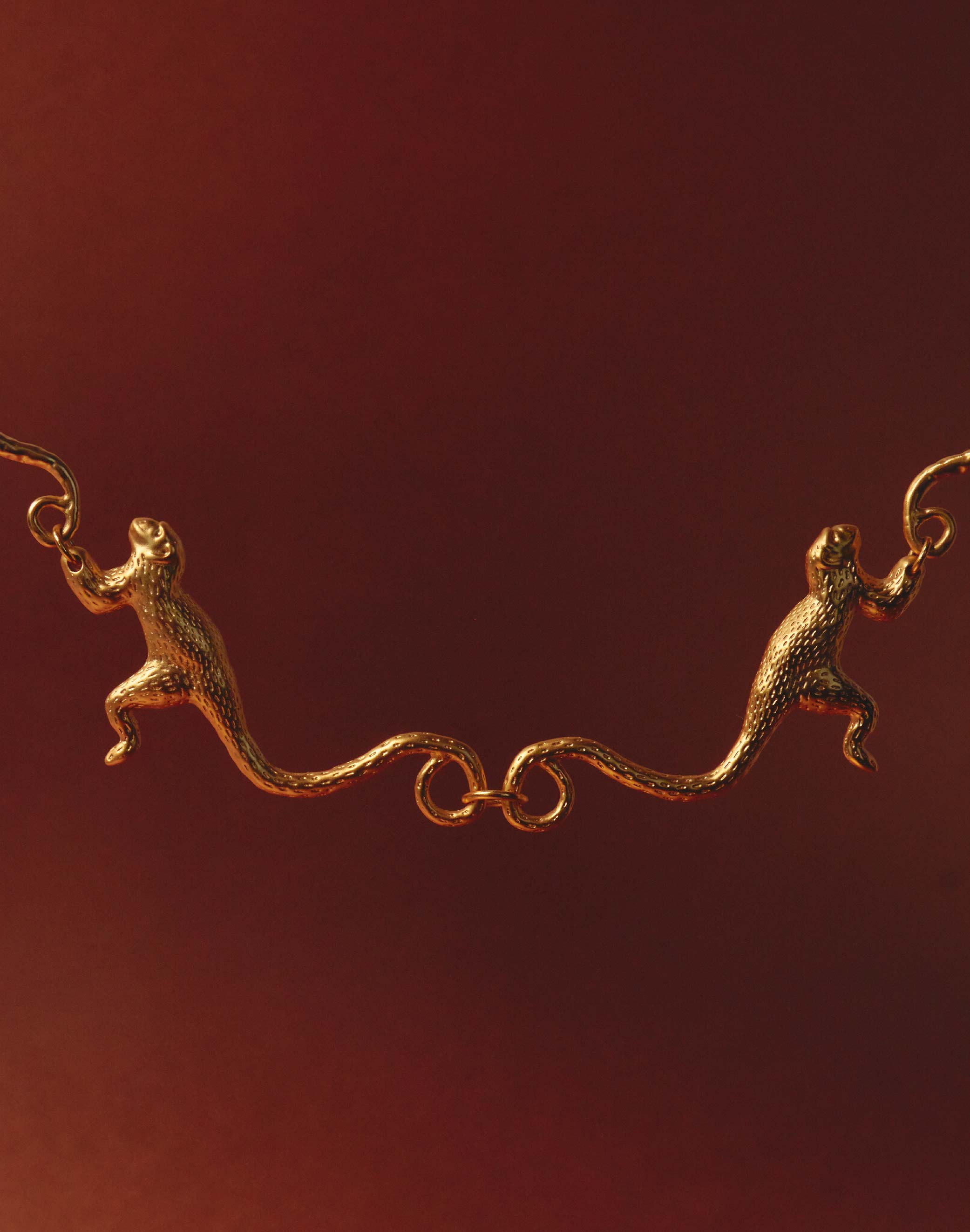 Nuestro Collar con dos Monos Tití unidos por la cola cuelgan para darle un toque divertido y único a tu estilo. ¡Ideal para los amantes de la naturaleza y la...