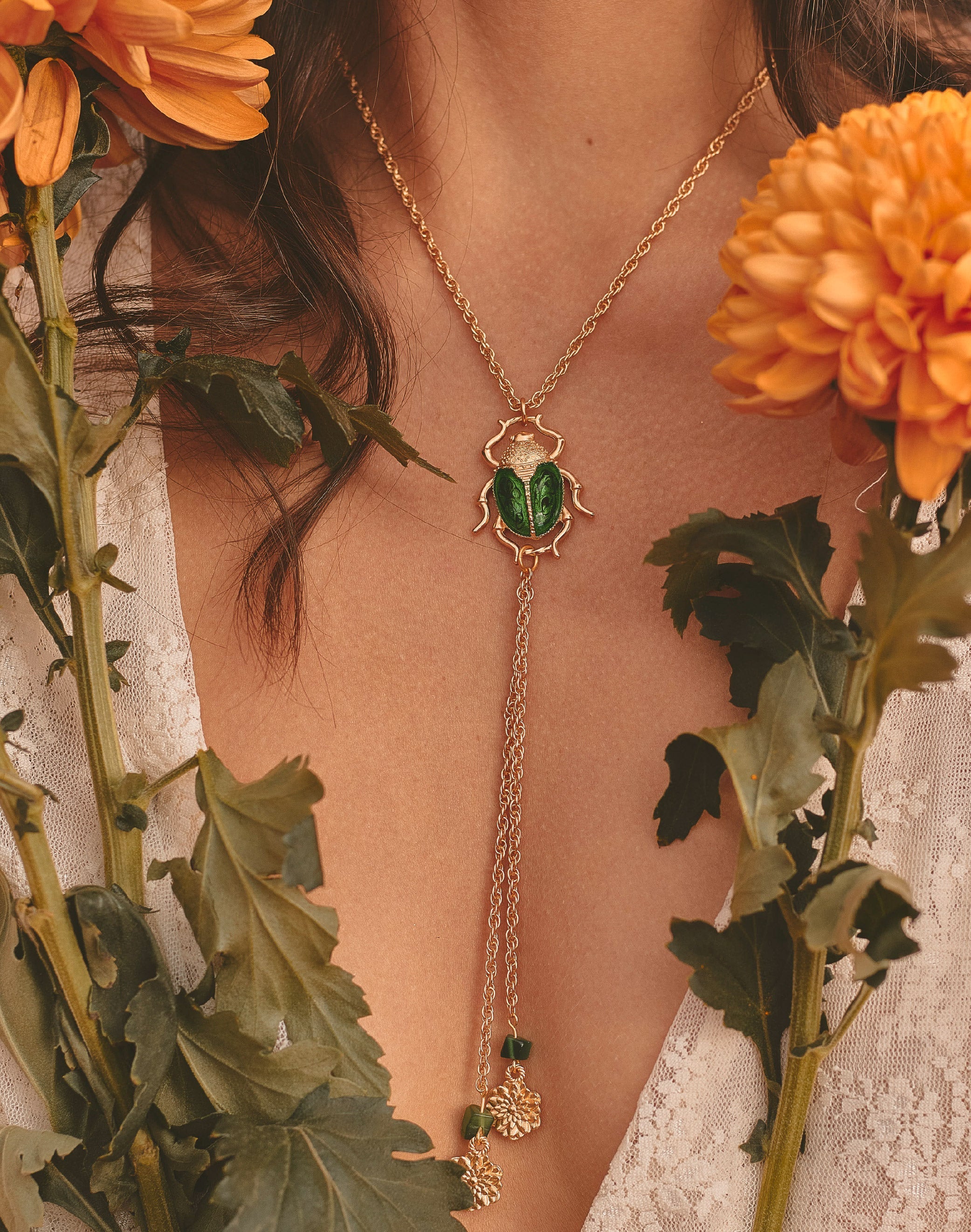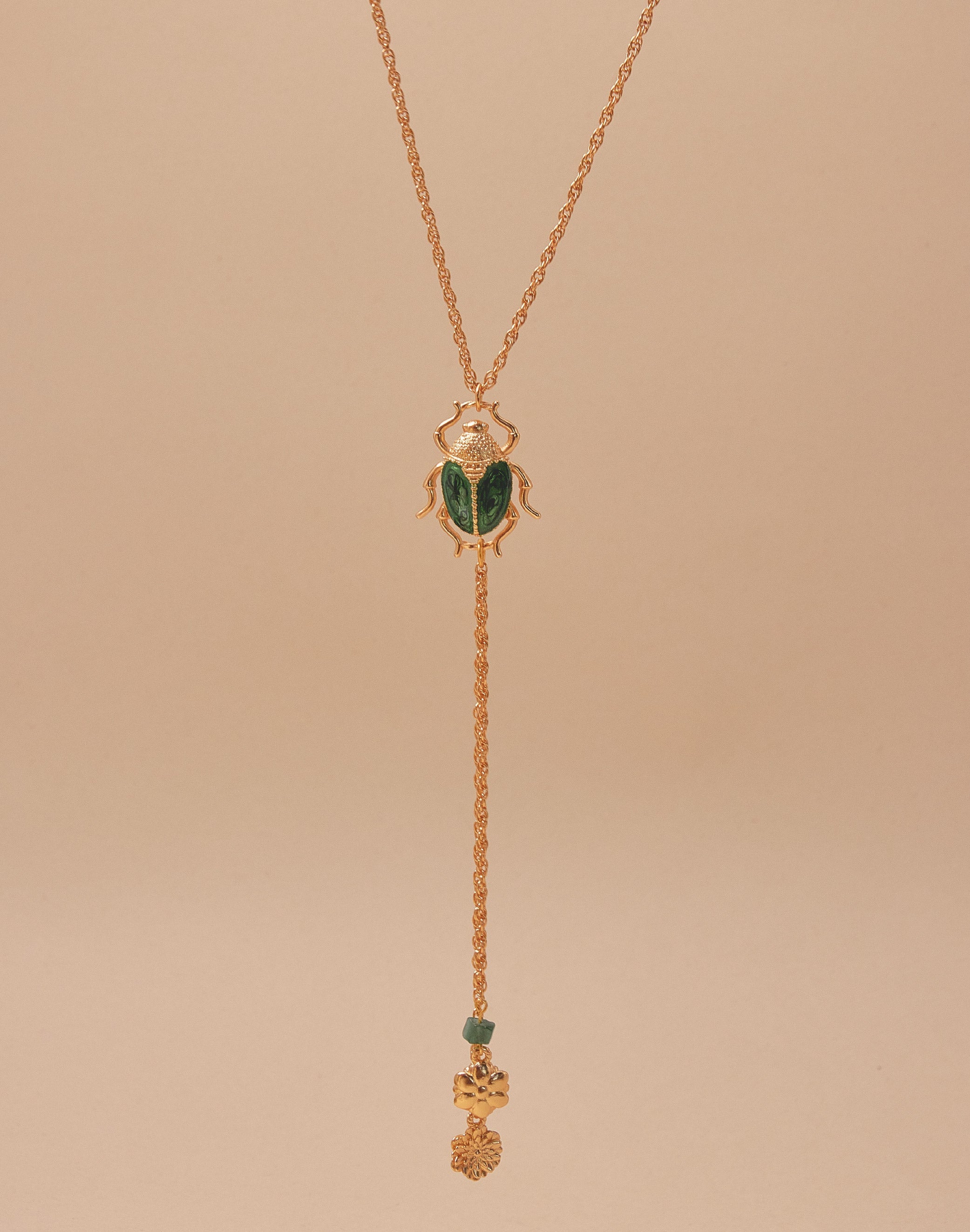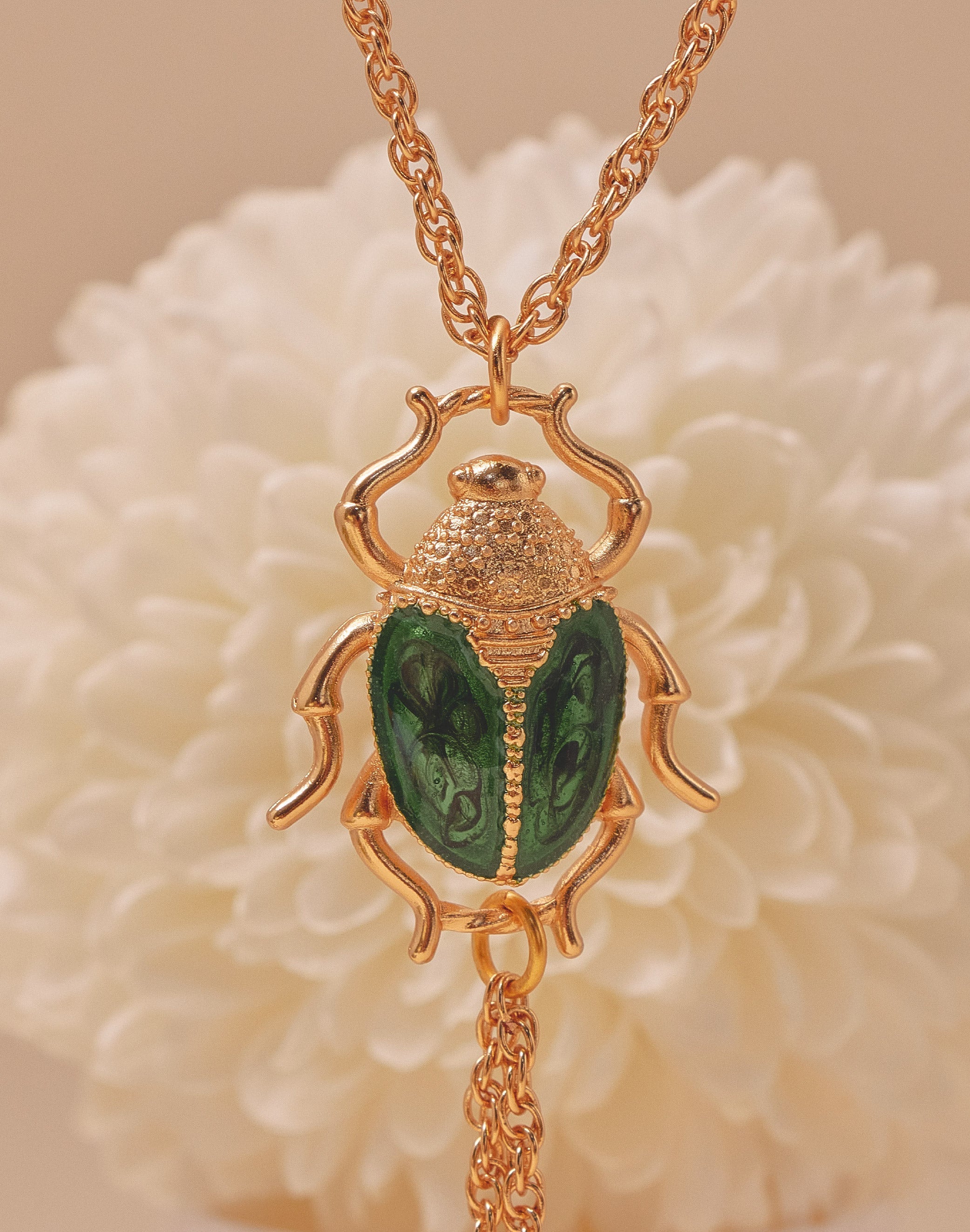 Un collar tipo corbata que une fuerza y delicadeza. El cucarrón en resina verde, pintado a mano, evoca el brillo natural de su caparazón, mientras los crisantemos colgantes simbolizan la conexión entre la flor y su guardián. Una pieza protagonista y escultórica.
