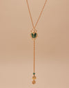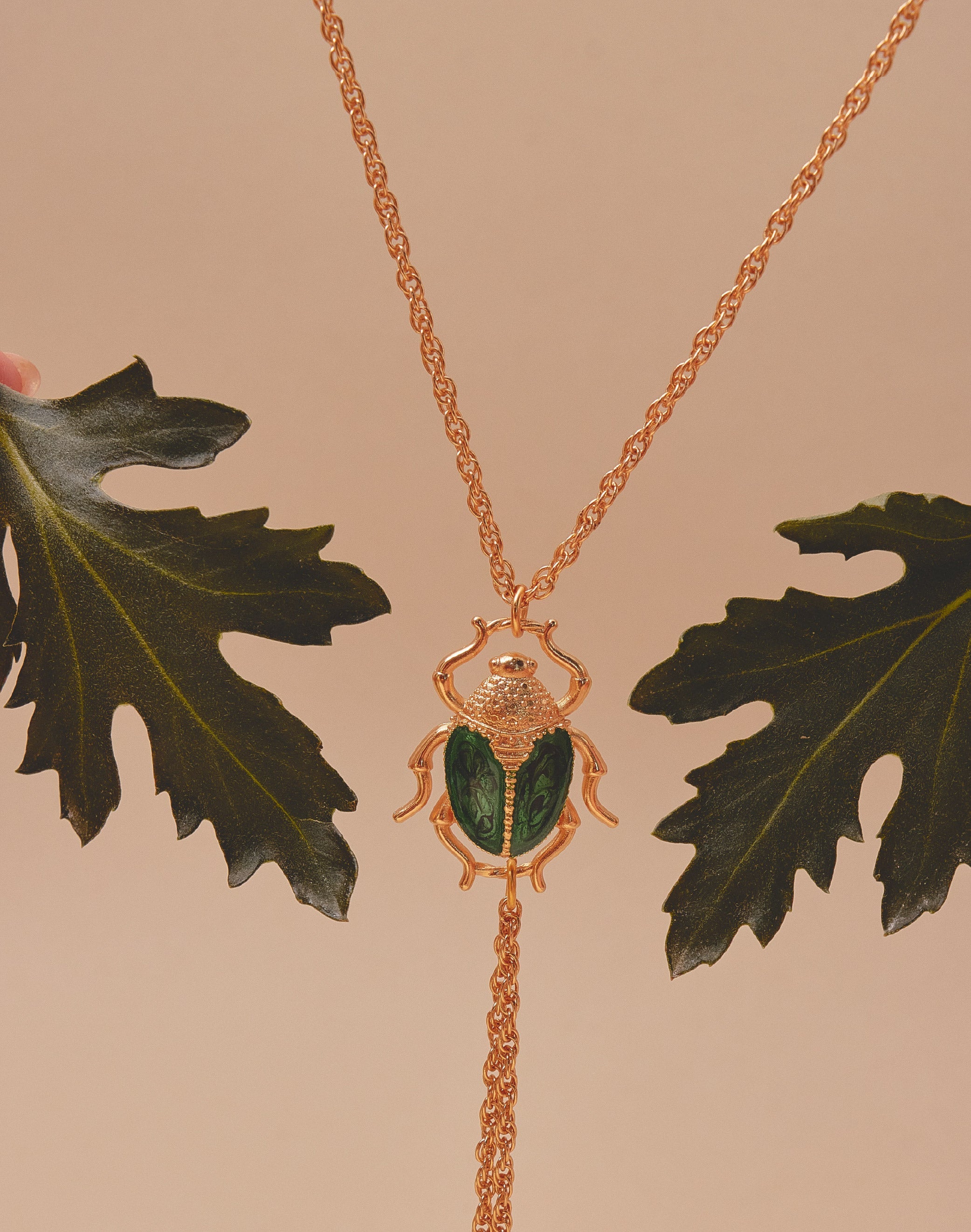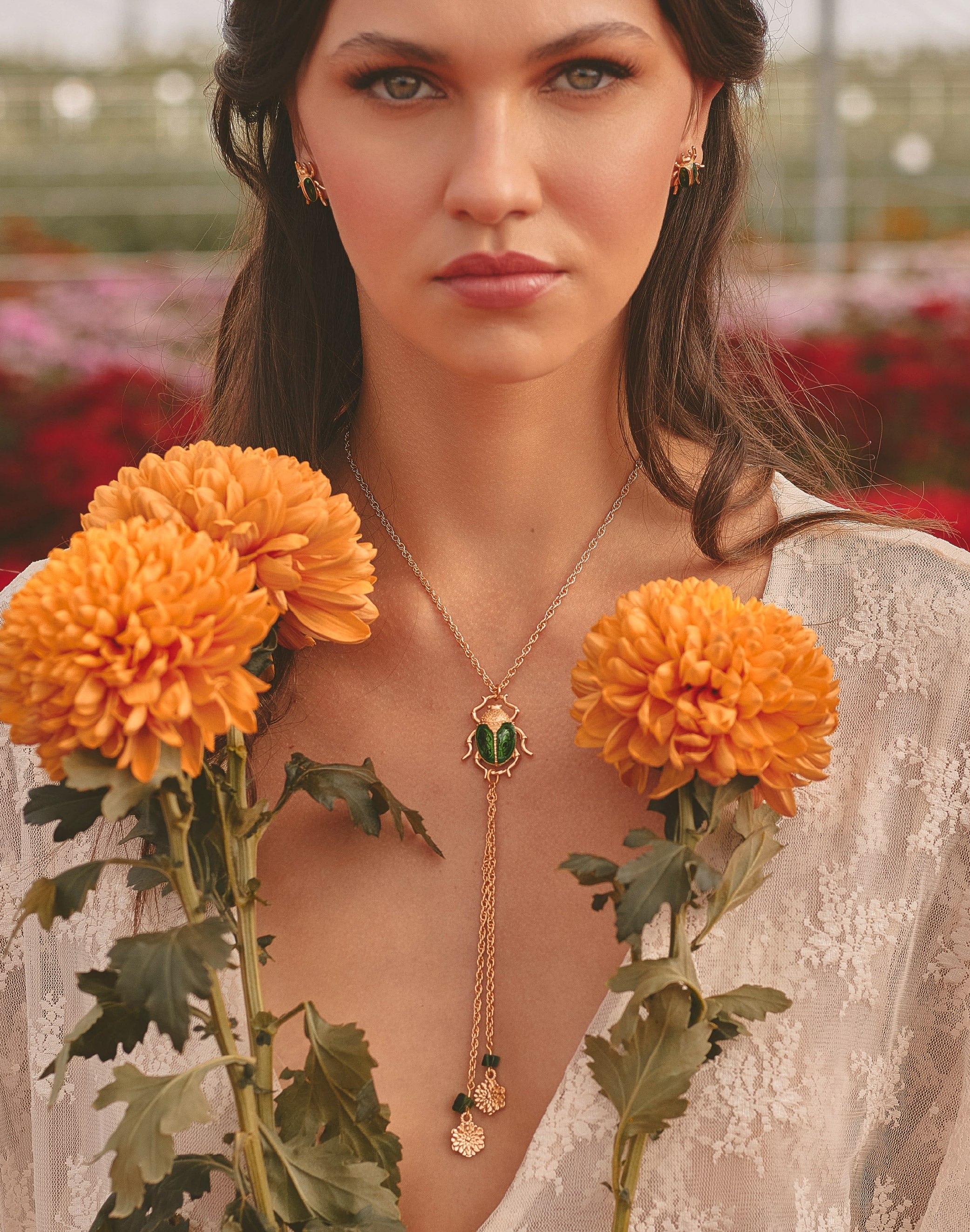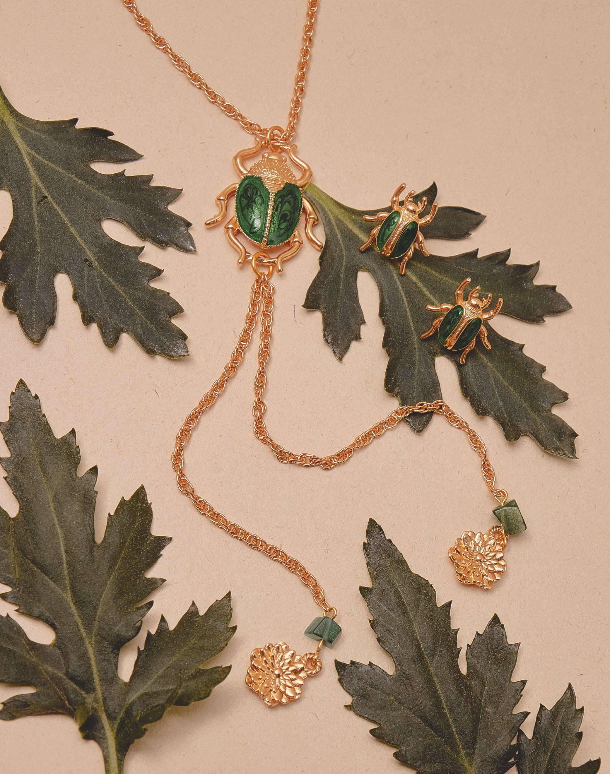 Un collar tipo corbata que une fuerza y delicadeza. El cucarrón en resina verde, pintado a mano, evoca el brillo natural de su caparazón, mientras los crisantemos colgantes simbolizan la conexión entre la flor y su guardián. Una pieza protagonista y escultórica.
