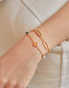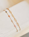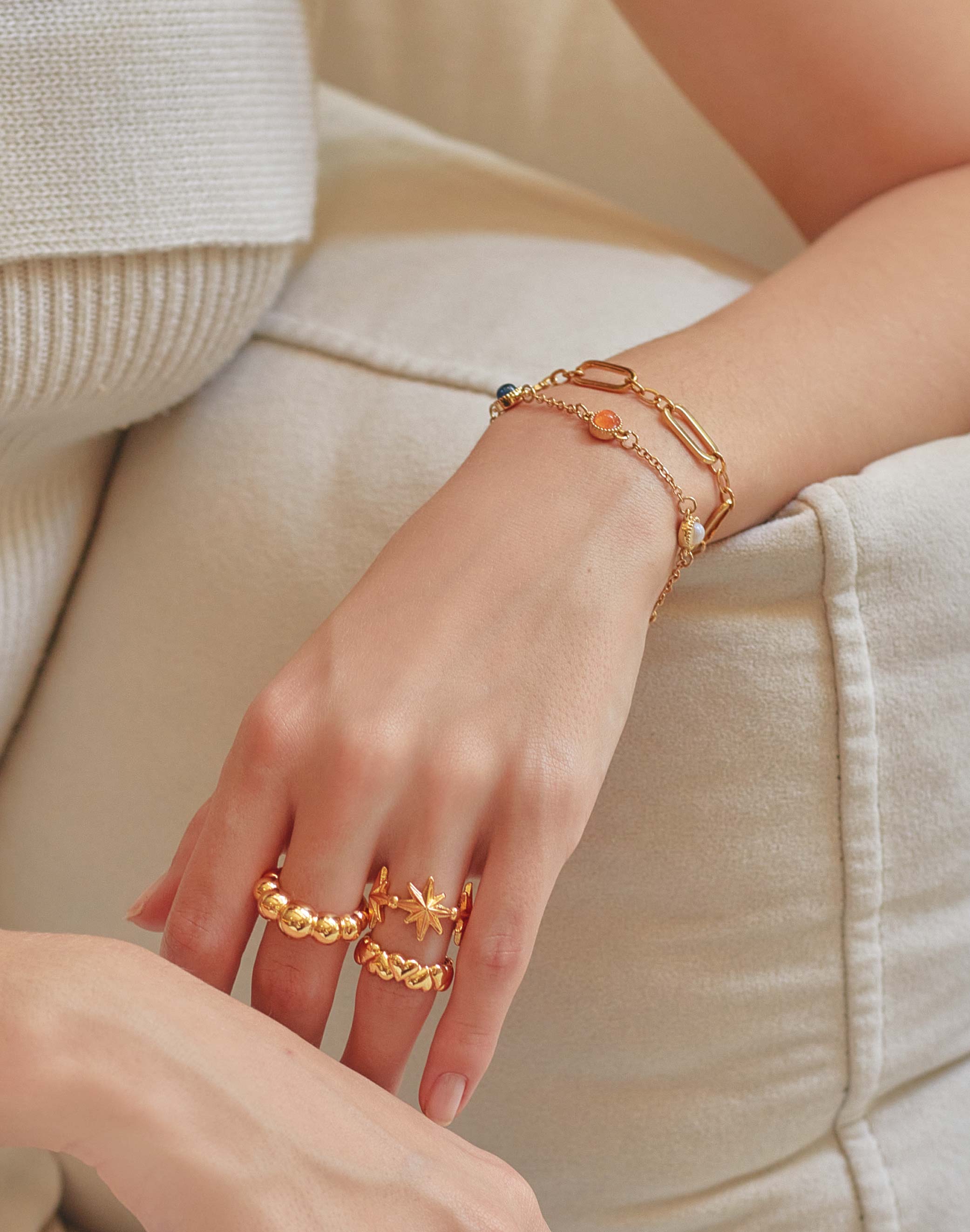 Un set de pulseras delicado y muy versátil. con un tejido de eslabones chunky y dijes con piedras elaboradas in house en tono: Ópalo, safiro, rosa cuarzo y azul montana.